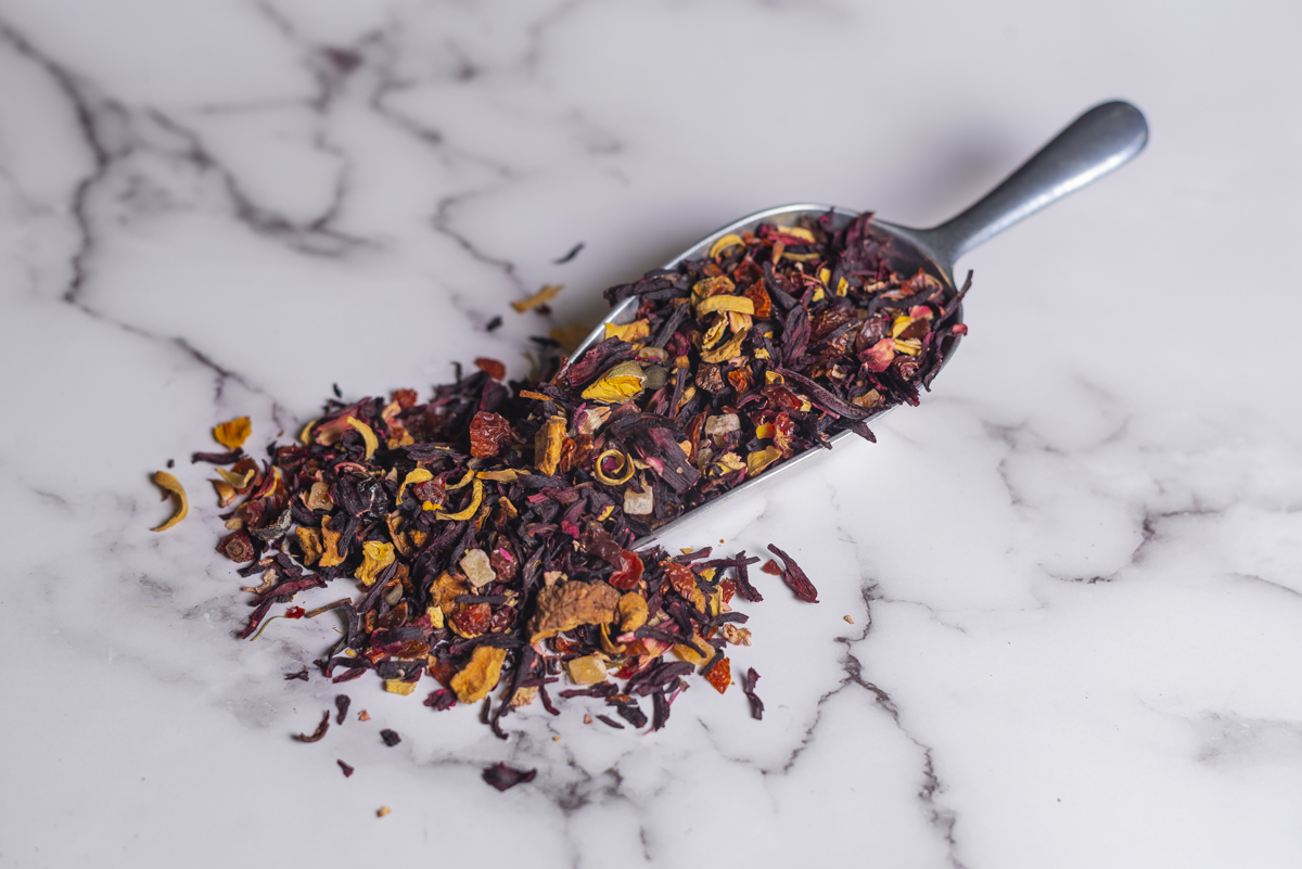 Ingredienti: Pezzi di mela, rosa canina, karkadè, scorze di arancia, aroma mela e pesca